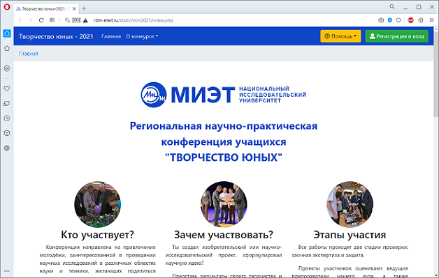 HTML, JavaScript, jQuery, PHP, MySQL, Google картыСайт научно-практической конференции школьников "Творчество юных", проводимой в нашем вузе для школьников 7-11 классов.
