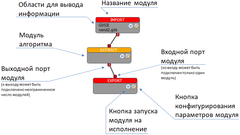 Данные, получаемые в результате выполнения одного модуля, передаются в следующий модуль. Таким образом формируется маршрут выполнения алгоритма обработки топологии интегральной схемы.